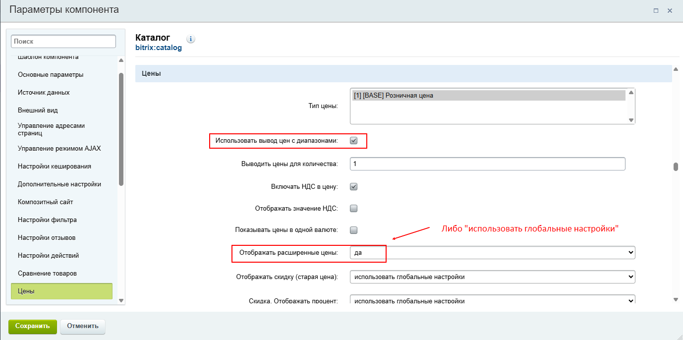 Для того чтобы выводить расширенный вывод цен у товара, в первую очередь необходимо включить данную настройку.