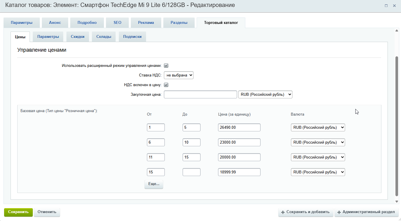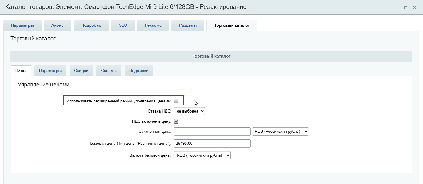 Затем необходимо открыть редактирование товара, и во вкладке "Торговый каталог" > "Цены" включить параметр "Использовать расширенный режим управления ценами":