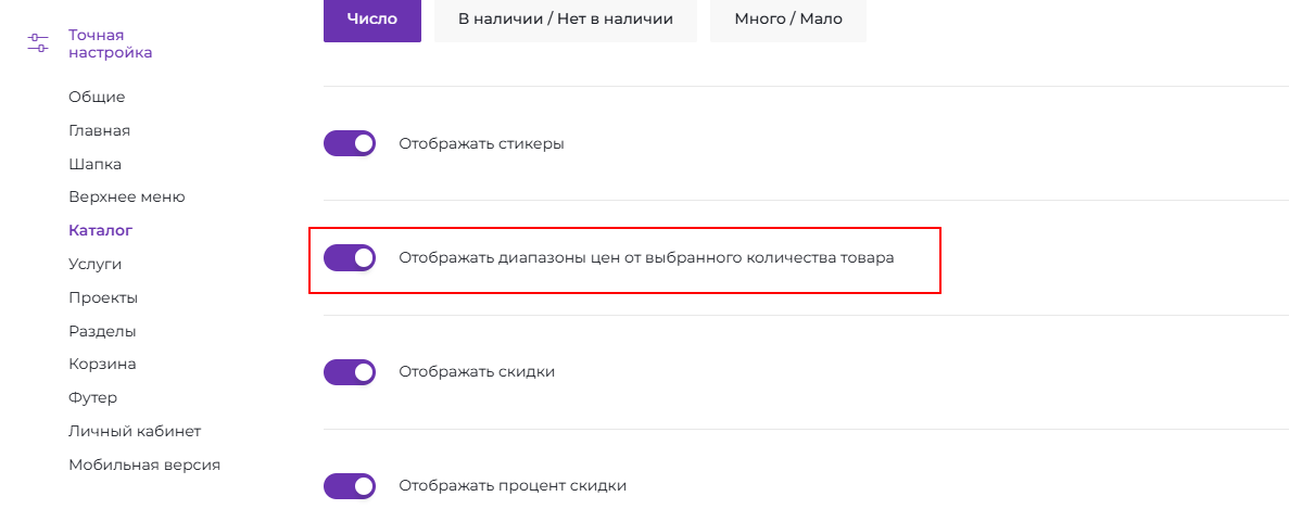 После чего отобразятся дополнительные поля для ввода диапазона количества товара и цены для данного диапазона: