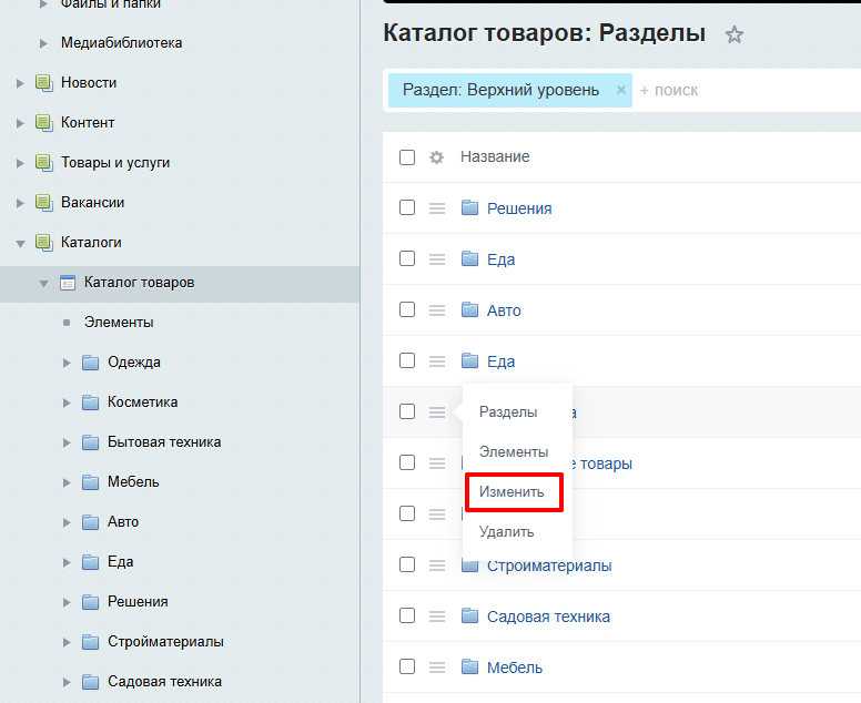 Для добавления иконки перейдите в корень каталога через админ панель, и откройте на редактирование один из корневых разделов.