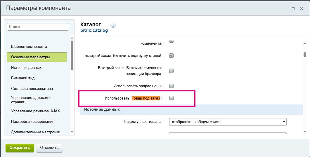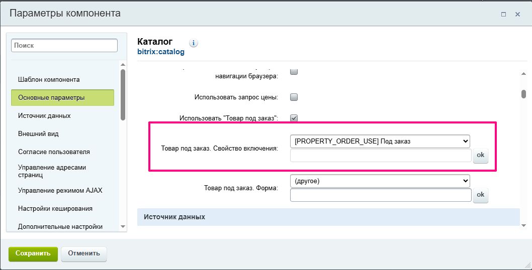 В поле «Товар под заказ. Свойство включения» выберите из списка пользовательское свойство инфоблока типа «Чекбокс». Если подходящего свойства нет, его нужно заранее создать в инфоблоке каталога.
