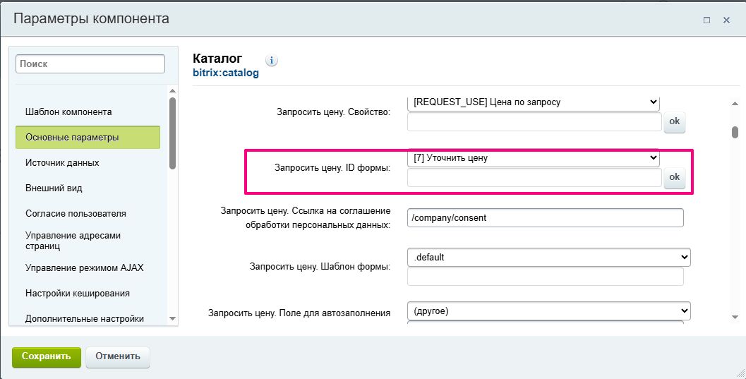 В настройке «Запросить цену. ID формы» выберите из списка нужную веб-форму, которая будет открываться при нажатии на кнопку.
