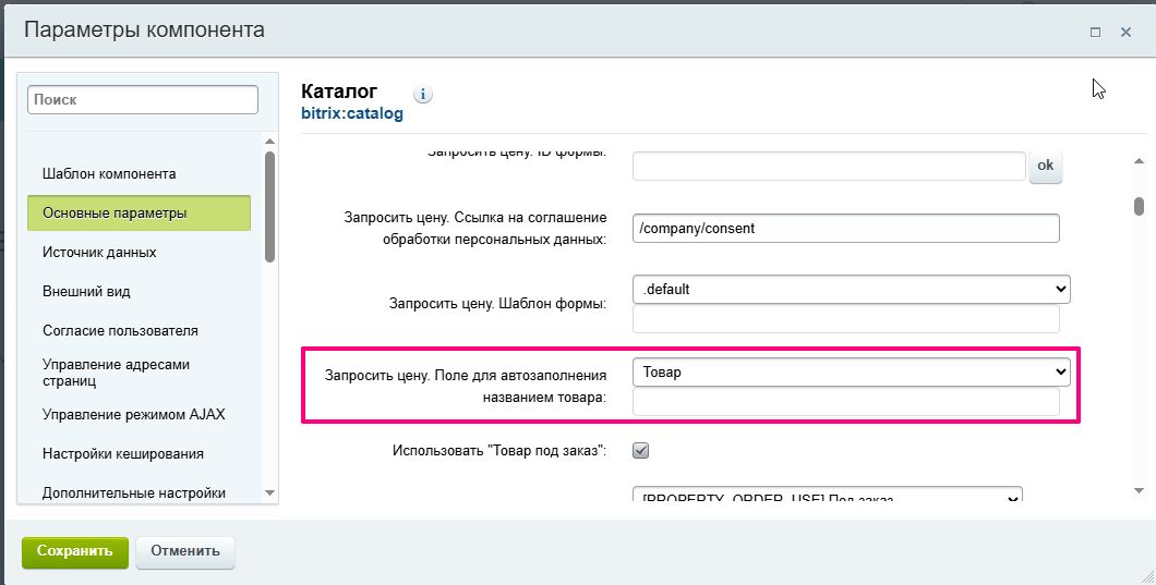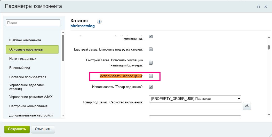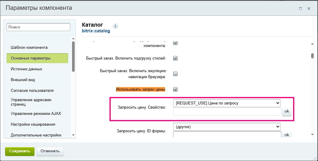 В поле «Запросить цену. Свойство» выберите из списка пользовательское свойство инфоблока типа «Чекбокс». Если подходящего свойства нет, его нужно заранее создать в инфоблоке каталога.
