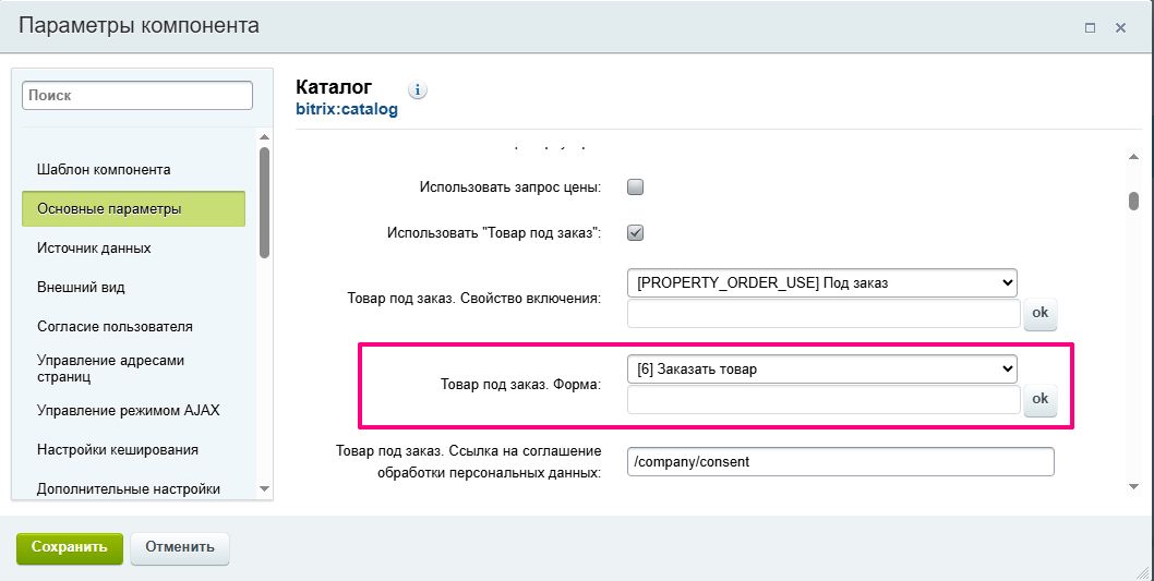 В настройке «Товар под заказ. Форма» выберите из списка нужную веб-форму, которая будет открываться при нажатии на кнопку.