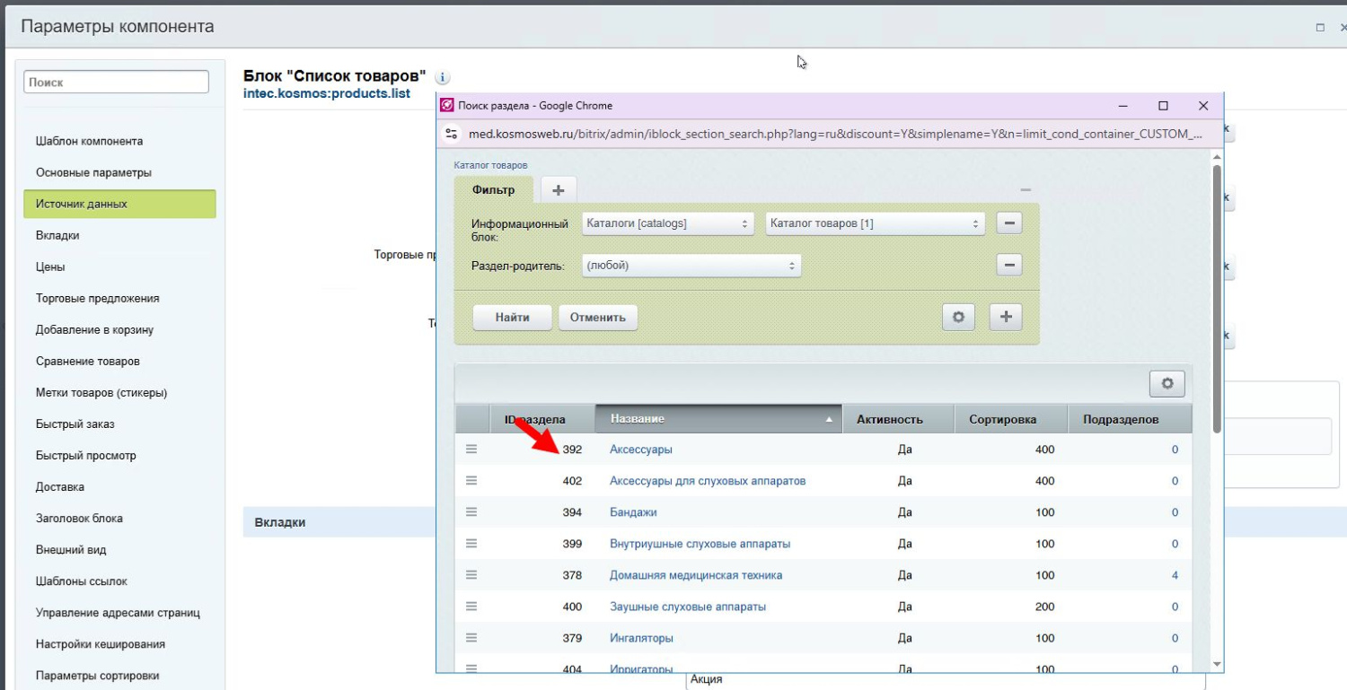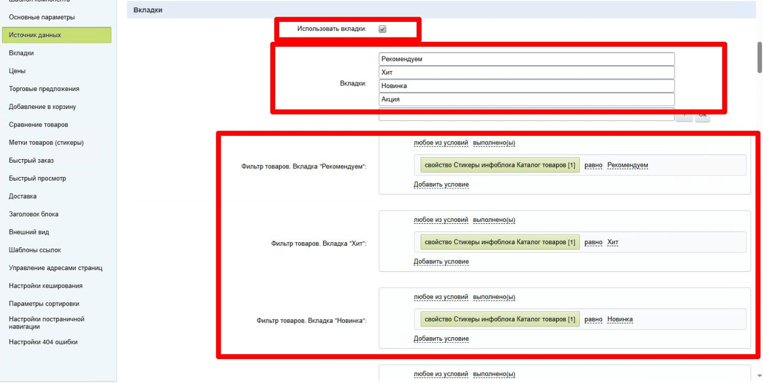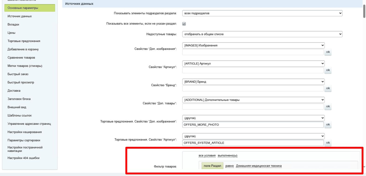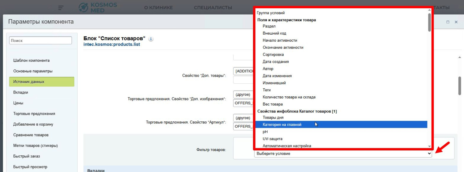 Для настройки категорий товаров в блоке используется фильтр товаров в разделе “Источник данных”. Фильтр позволяет задать условия вывода, например, из определенного раздела. Для этого нажимается выбор условия, из списка выбирается условие отбора и параметр для отбора элементов.