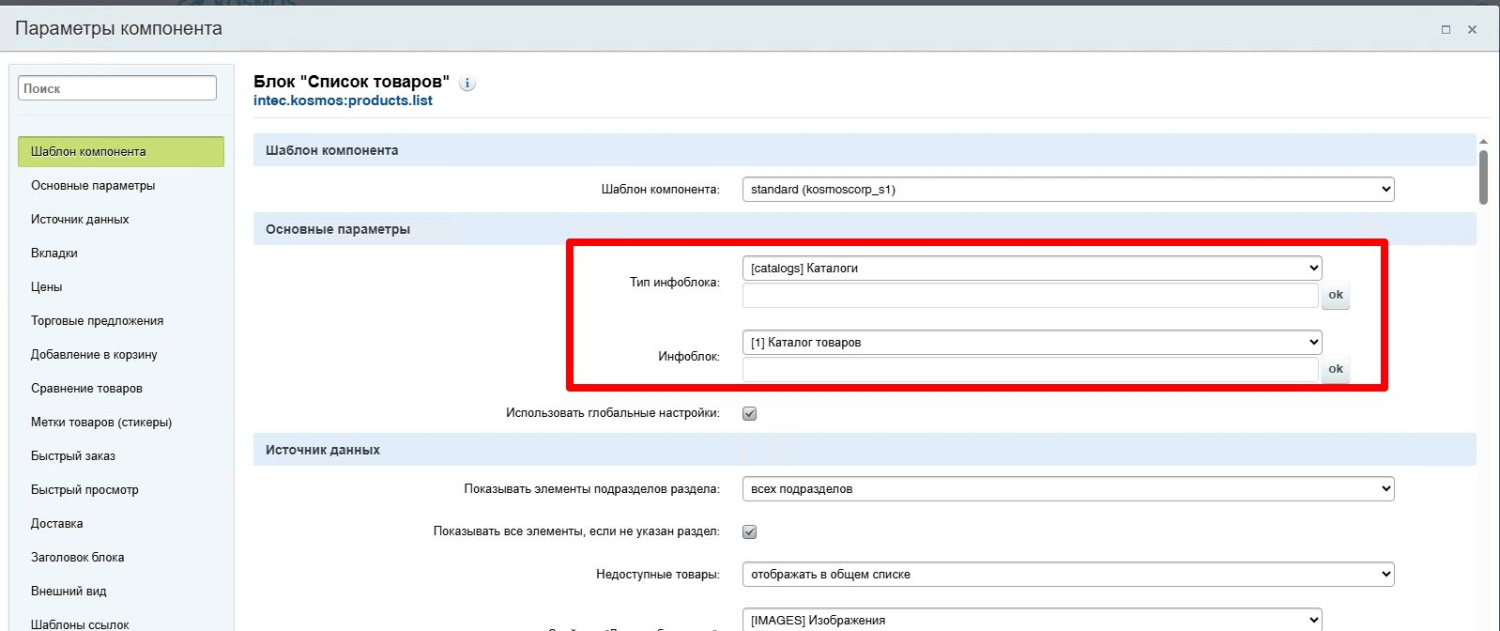 В разделе “Основные параметры” компонента выбирается тип инфоблока “Каталог” и конкретный инфоблок каталога товаров для подтягивания элементов.