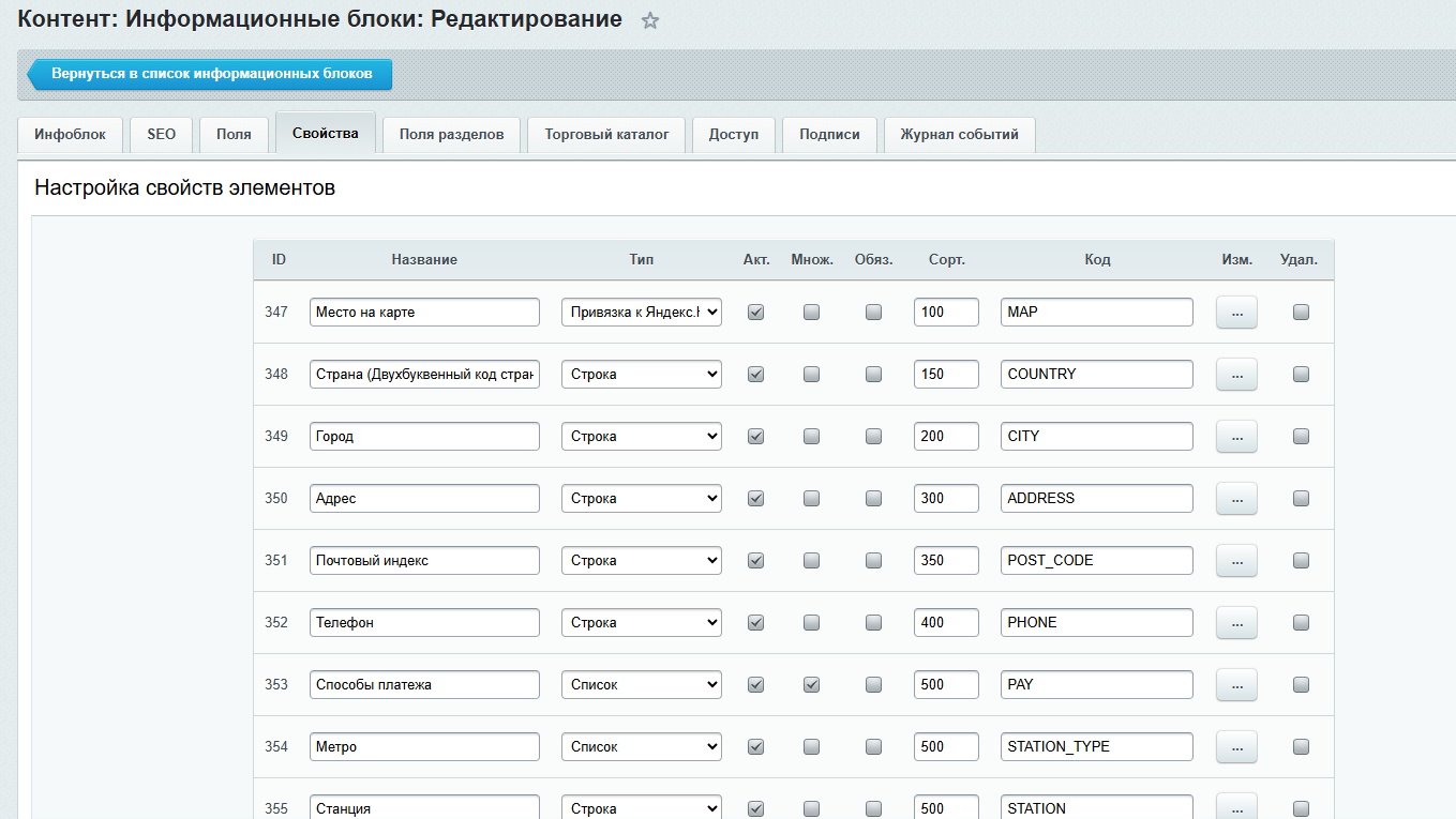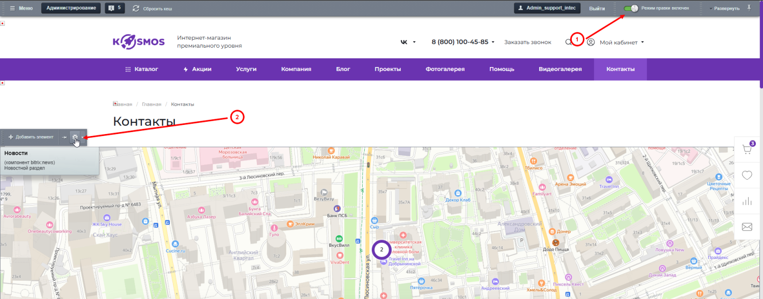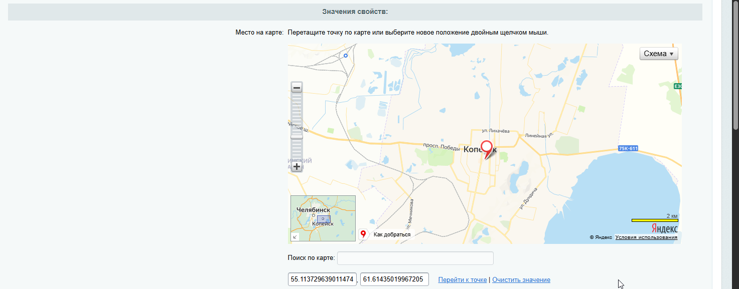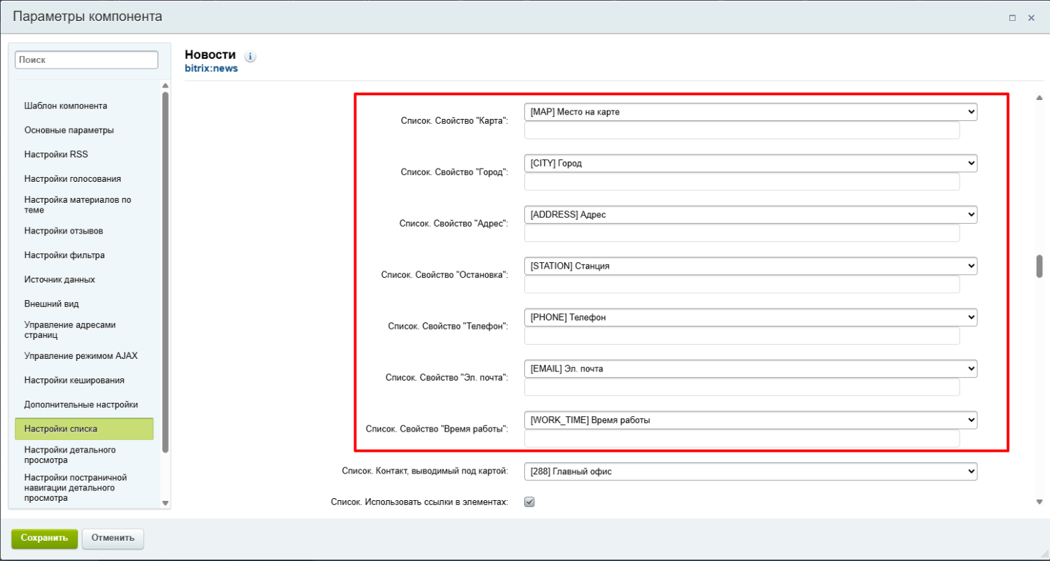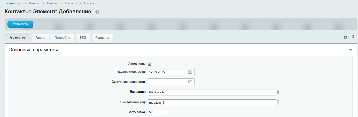 Теперь создадим элементы для этого раздела. Сначала заполним поле "Название". Поле "Внешний код" заполнится автоматически при сохранении элемента. Затем заполним основные свойства для элемента и отметим место на карте (путём двойного клика на карте либо указания координат в соответствующих полях), которое будет отображаться на странице контактов.