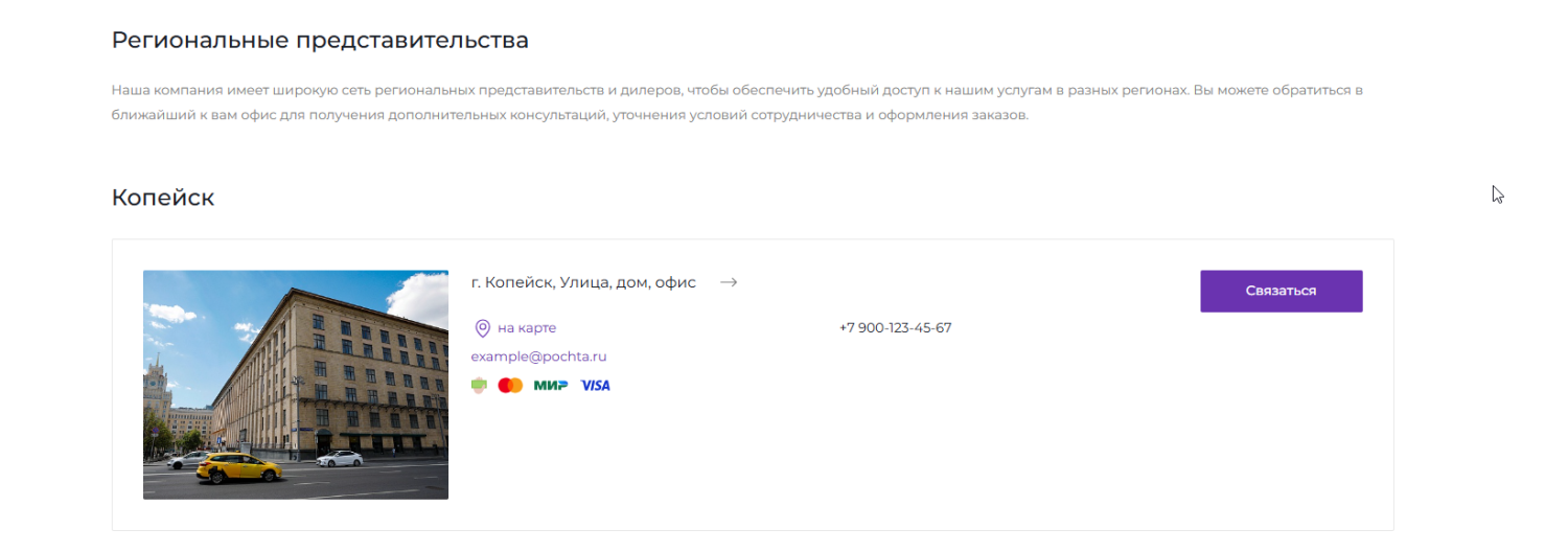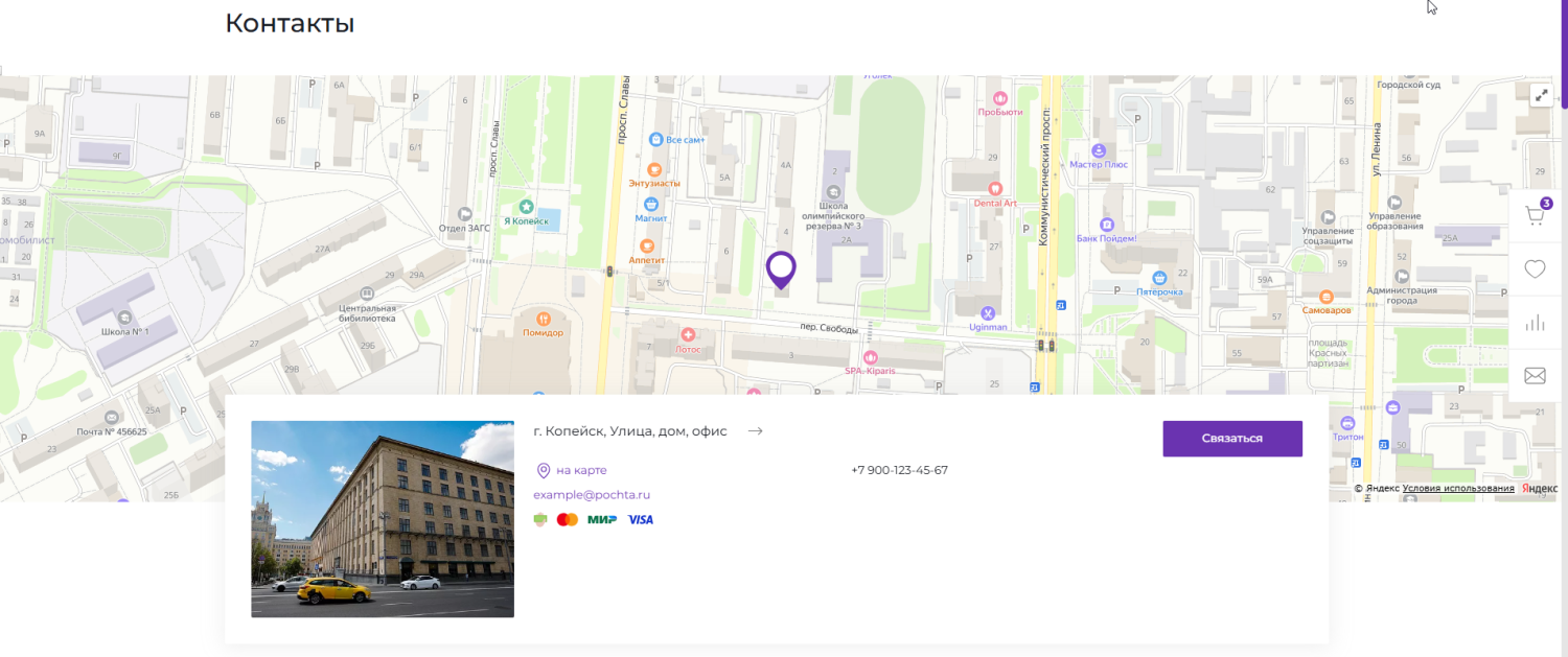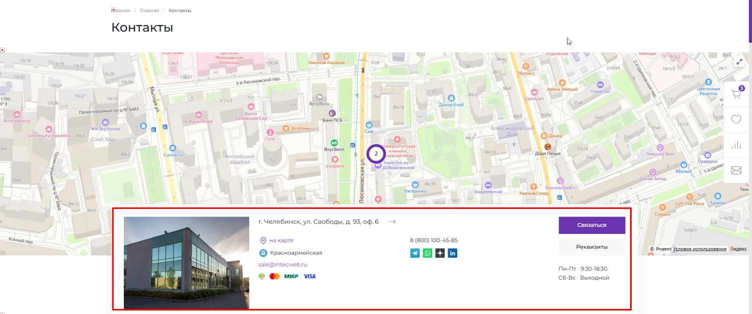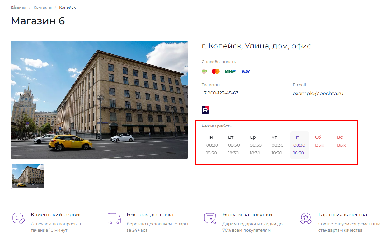 В результате мы создали раздел "Копейск" с элементом. Теперь он отображается на странице контактов. Кроме того, можно выбрать, например, "Магазин 6" в качестве главного контакта, чтобы он отображался на странице вместе с картой и своими контактными данными.