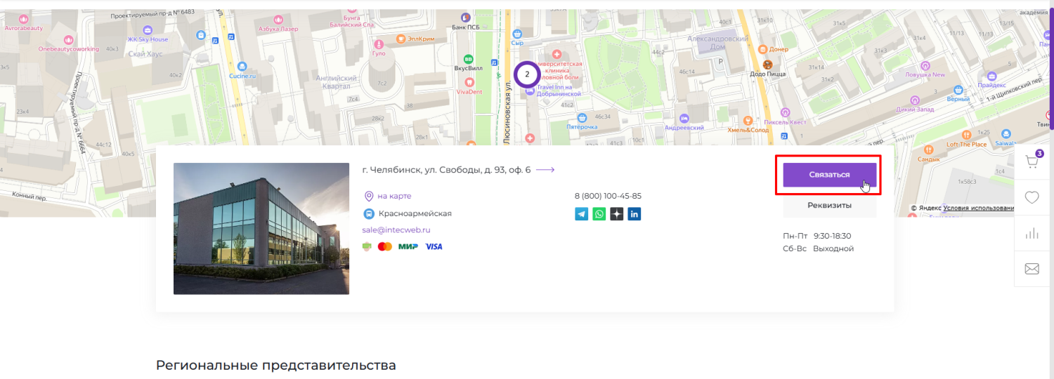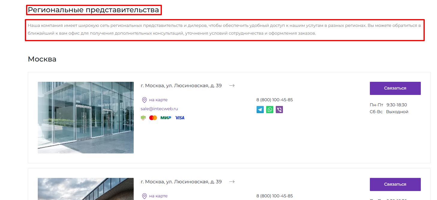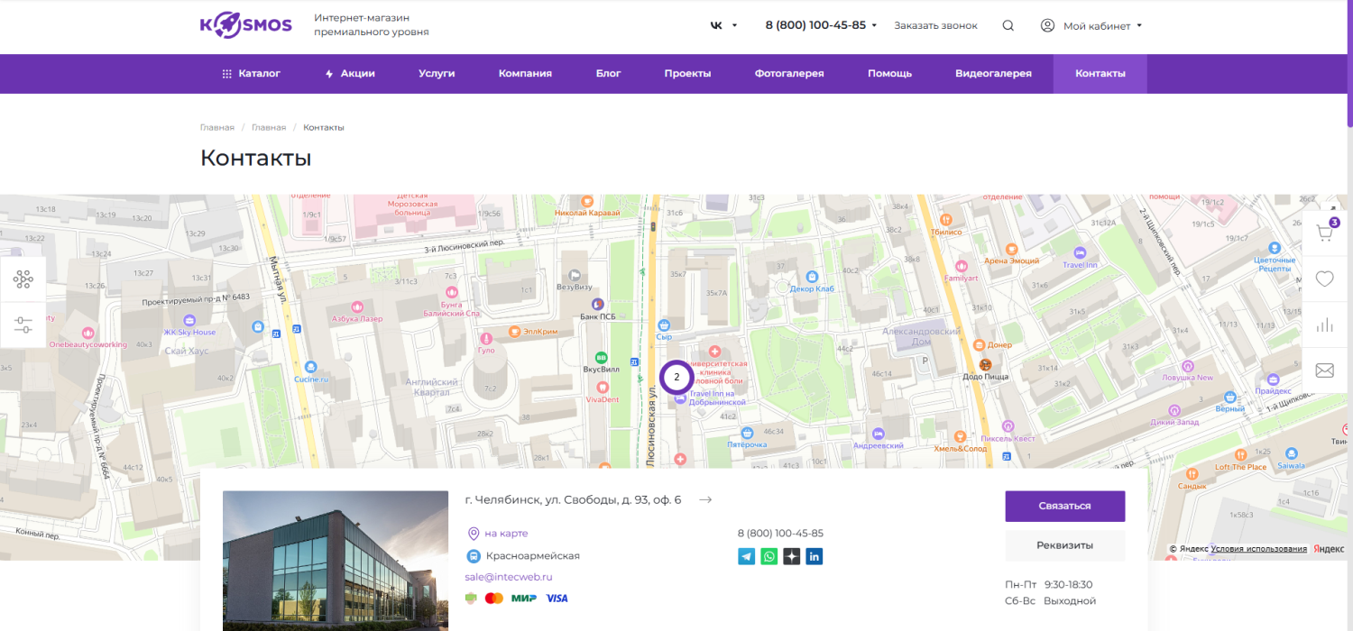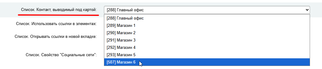 В результате мы создали раздел "Копейск" с элементом. Теперь он отображается на странице контактов. Кроме того, можно выбрать, например, "Магазин 6" в качестве главного контакта, чтобы он отображался на странице вместе с картой и своими контактными данными.