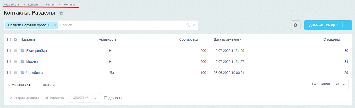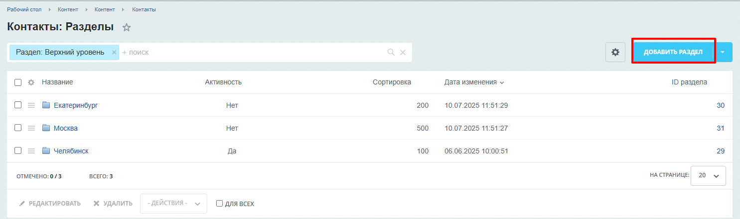 В этом инфоблоке можно добавлять как разделы, так элементы. Создадим, например, раздел "Копейск", в который потом добавим пару элементов - магазинов. Кликнем по кнопке "Добавить раздел".