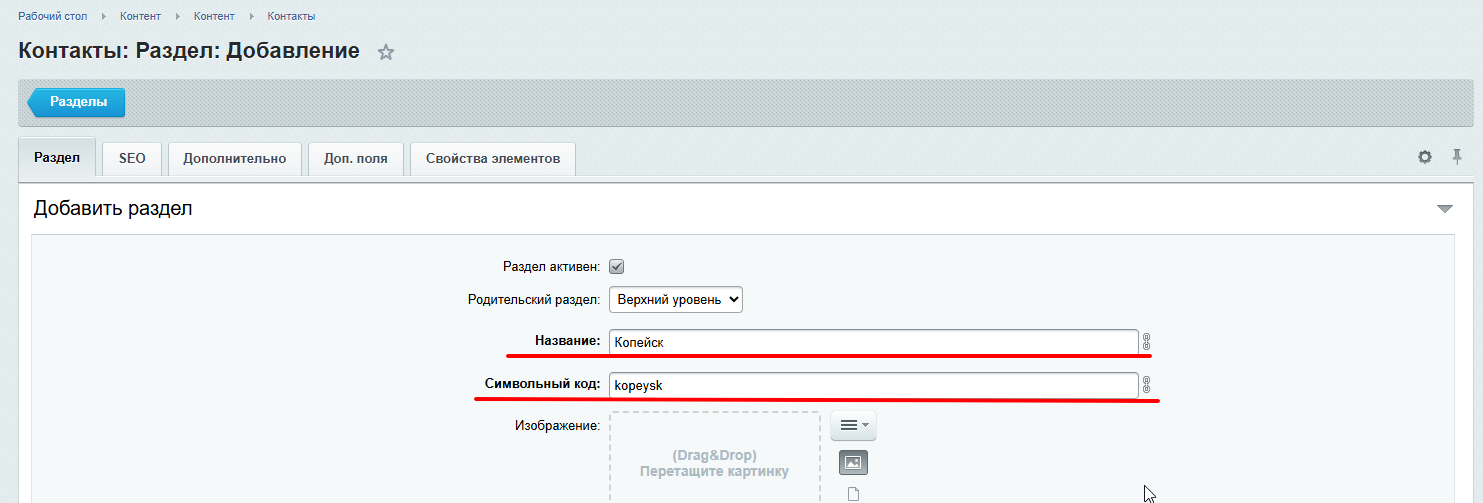 При создании раздела важно заполнить обязательные поля - "Название" и "Символьный код". Затем сохраняемся.