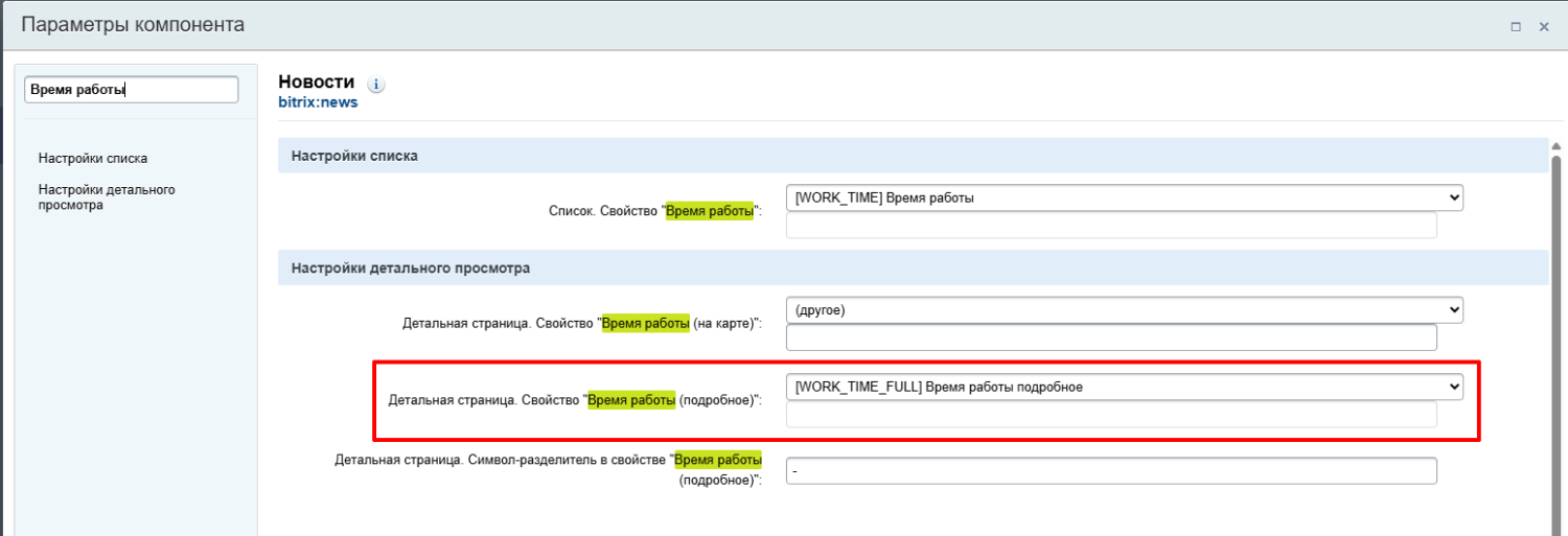 После этого, необходимо в настройках компонента на странице, указать данное свойство в параметре "Детальная страница. Свойство "Время работы (подробное)"":