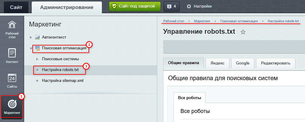 Если данный раздел закрыт, обратитесь в техническую поддержку сайта. Сам файлRobots.txt находится в корневом разделе сайта. Структура сайта-> Файлы и папки->robots.txt.