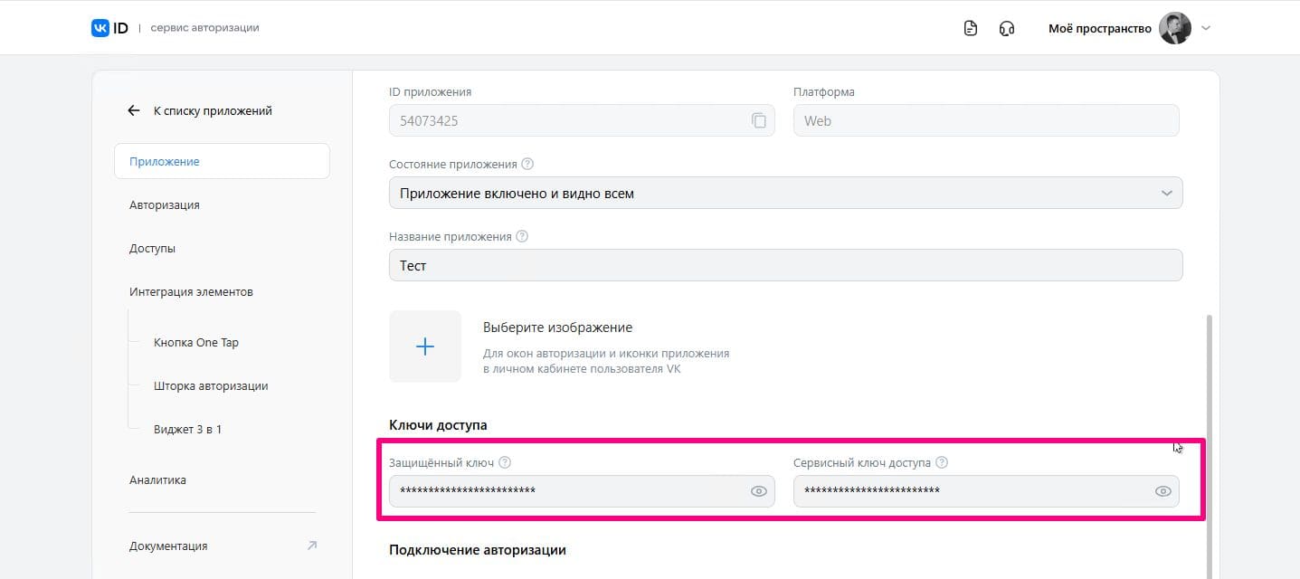 - Перейдите в настройки приложения и скопируйте данные из полей ID приложения и Защищённый ключ.