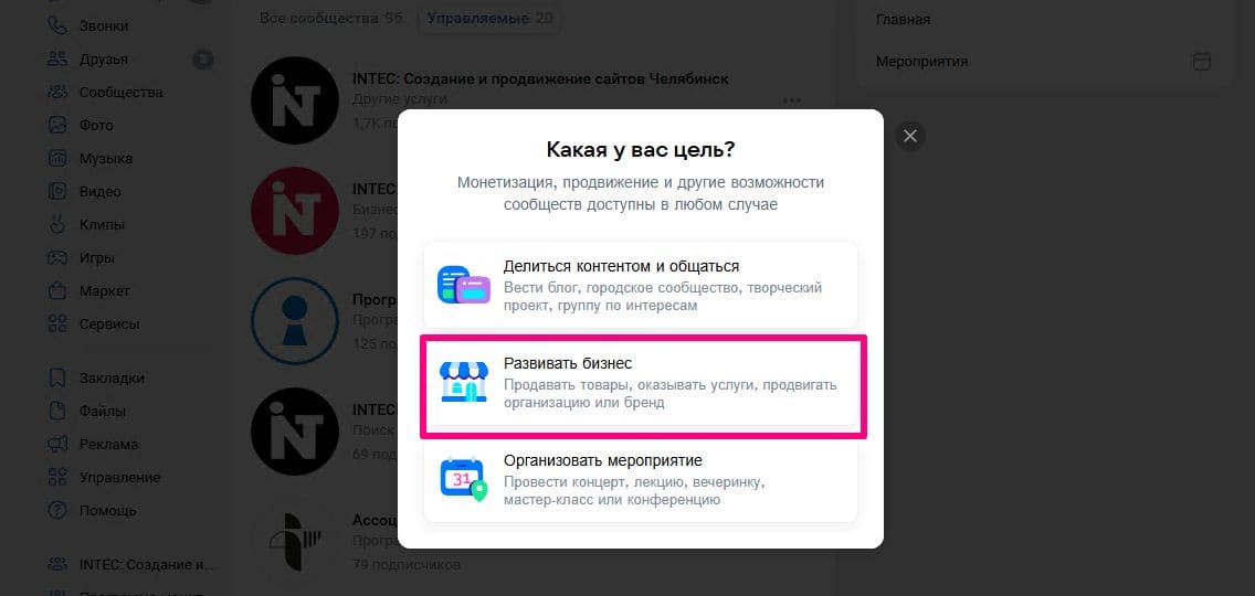 - Создайте сообщество с целью Развивать бизнес